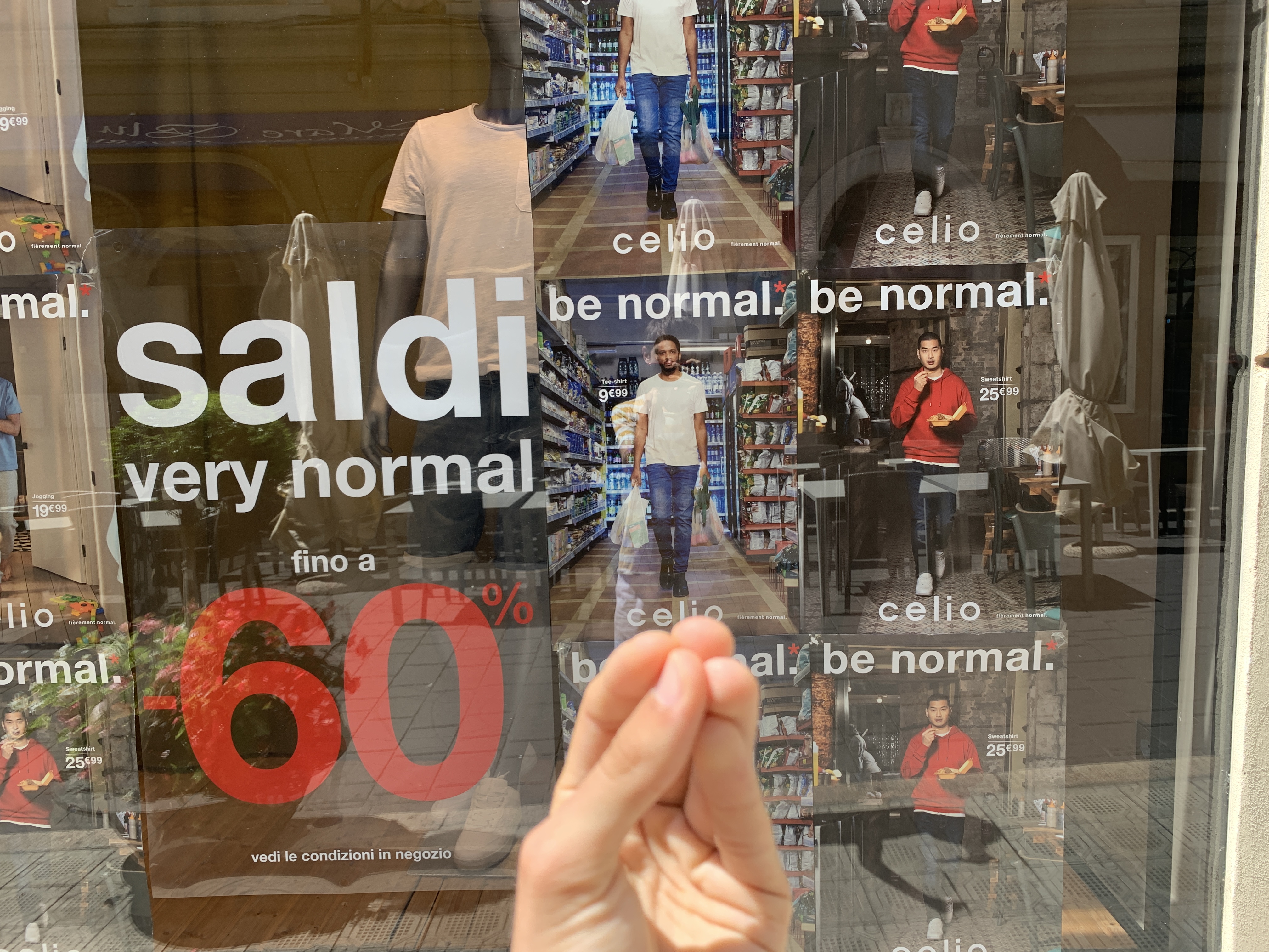 1984: “be normal” Endless discounts? Very normal. And you too: be normal. Okay? JUST BE NORMaL OK??? Celio clothing store in Sanremo, Italy