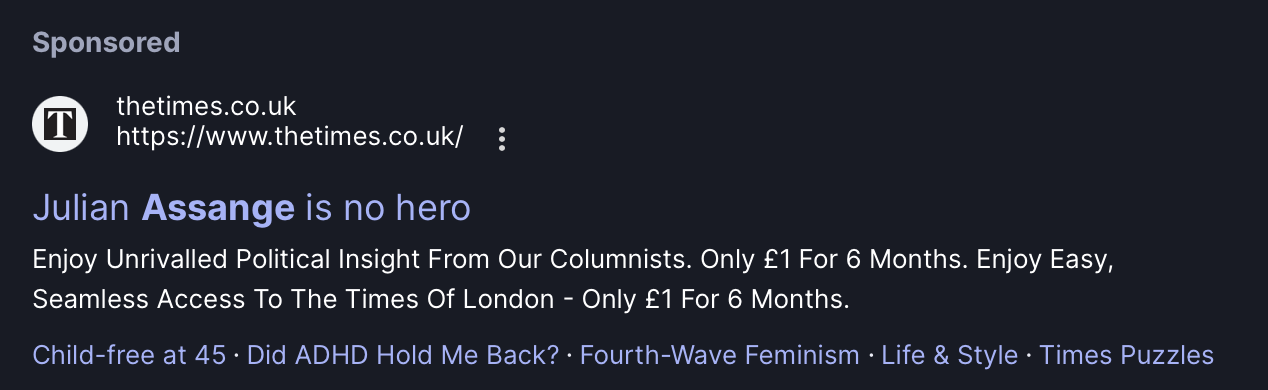 Why the hell are The Times paying for an anti-Assange advertisement? And when did child-free feminist nonsense become more important than life, style, and puzzles?